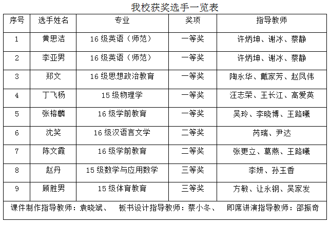 我校选手在历届安徽省高等学校师范生教学技能竞赛中均取得了优异成绩,这既是我校贯彻落实国家中长期教育发展规划和深化教师教育课程改革的结果,也充分体现了学校实践育人的办学理念。