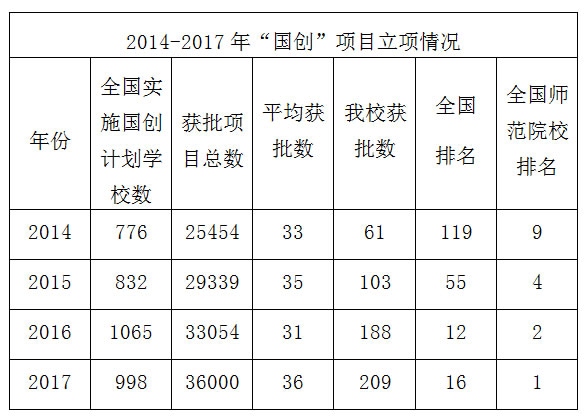 2017年3月至5月,教务处开展大学生创新创业训练计划项目网上申报工作,学生参与热情高涨,校内创新创业氛围浓厚。经学生自主申报、指导教师审核、学院专家组评议推荐、学校评审、遴选优秀项目报省教育厅评选,最终由省教育厅报教育部审批。