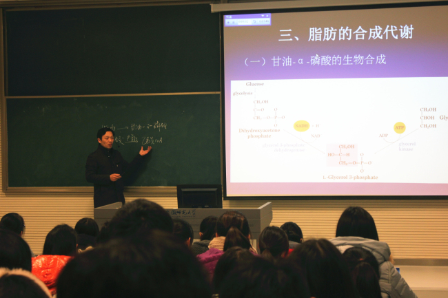杨如意教授首先回顾了“脂肪分解”的重点内容,分析了脂肪分解与合成的关系,并以问题形式导入,内容过渡十分自然。他着重介绍了脂肪酸在细胞质中的合成过程,对各步反应过程逐一推导,步步推进,使枯燥繁琐的代谢途径被演绎得生动而简洁。随后,他对比脂肪酸在细胞质、线粒体、微粒体三个不同部位合成方式的区别,将零碎的知识点网络化、系统化,清晰地勾勒出了脂肪代谢的脉络,便于学生理解和记忆,使得相关的教学内容融会贯通。最后,杨老师总结了整节课程的内容,突出重点,帮助学生理清了思路。