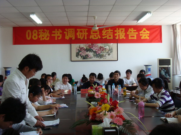5月7日下午, 文学院在院行政楼四楼会议室举行了文秘专业学生调研总结报告会。文学院副院长张树文、调研活动的指导老师杨树森教授、秘书专业主任王茂跃教授出席了本次会议。
