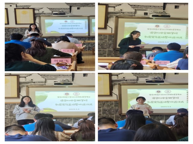 实习基地与专业结合日常表现,秉持公平公正的原则,评选出吴君瑜、姚明惠、张妮、代常娇四位同学为优秀实习生,并由小学部部长张莉颁发证书。清华附中合肥学校也为16名实习生准备了纪念品——学科指导教师精心挑选的书籍以及附有实践老师赠语的明信片等,既承载着清合的校园文化,也寄托着对我院实习生的殷切期望。